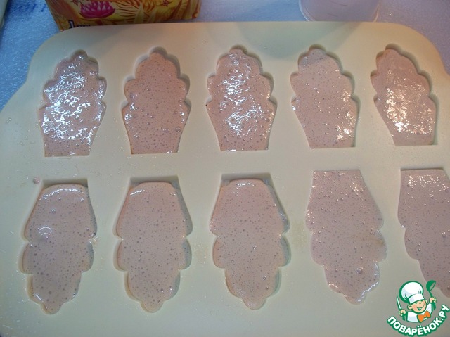 Далее берем формочки для мадленок, смазываем их и выкладываем нашу сахарно-кофейную массу. Ставим в духовку при t 140 градусов на 1,5 часа. За это время печенье сверху застывает, а нижняя сторона остается мягкой, пластичной (не тянется, как в некоторых безе, а именно мягкая и хорошо жуется). Затем достаем аккуратно наши печеньица, соединяем половинки мягкими сторонами. Больше между печеньями ничем не промазываем. В процессе выпечки, на дне формочек (под печеньем) образуется немного сиропа, который затем застывает. Вот как раз им я и украсила печенье.