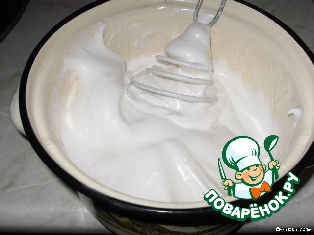 Холодные белки взбить до пиков. Постепенно добавить сахар.