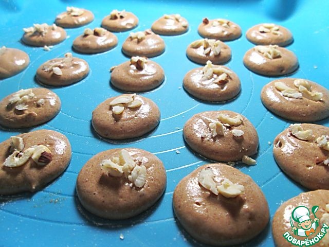 Отсаживаем печенье внутрь выделенных контуров, держа мешок для выпечки вертикально, один раз легонько ударяем подносом об стол, чтобы исчезли "хвостики". Можете украсить печенье по своему вкусу стружкой измельченного фундука. Оставляем печенье подсыхать около часа. За это время сверху образуется корочка, если вы легонько тронете печенье пальцем, палец останется сухим. Если это так, печенье готово к выпеканию. Выпекаем печенье в разогретой духовке 10 минут при температуре 160 гр. Цельсия. Духовки могут различаться, я привожу оптимальное время и температуру для своей. В электрической я не выпекала, но для газовой обязательно нужно ставить поднос с печеньем на самый верхний уровень и под него на более нижний поставить еще один пустой противень. Тогда высока вероятность того, что все получится. После выпекания даем печенью остыть в течении нескольких минут и снимаем его с коврика. Таким образом у меня получилось 78 половинок печенья, т. е. 39 сложенных попарно макаронс.