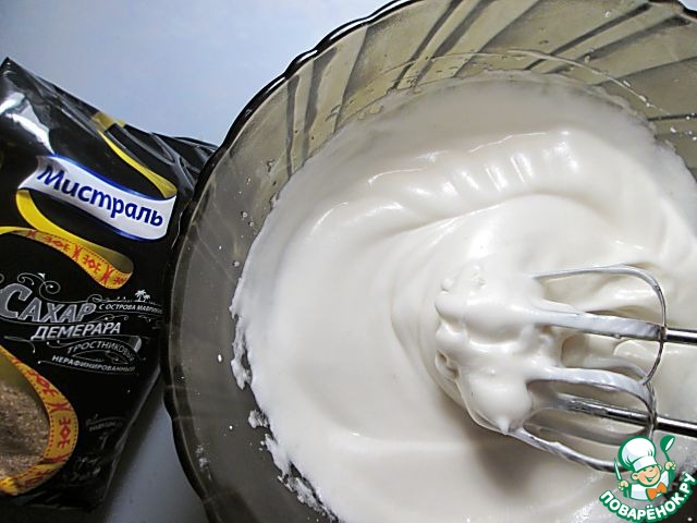 Белки, отделенные от желтков не менее, чем за 2 суток перед приготовлением, т. е. состаренные, взбиваем сначала в пушистую пену, потом начинаем небольшими порциями добавлять сахар. Взбиваем до полного растворения сахара и до "жестких пиков". Оставляем взбитые белки на две минуты.