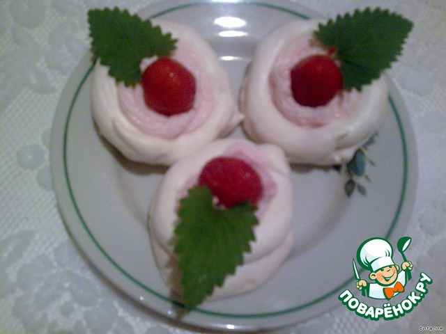 Творожок поместить в кондитерский шприц и выложить их него в серединку безе, как в корзиночку.