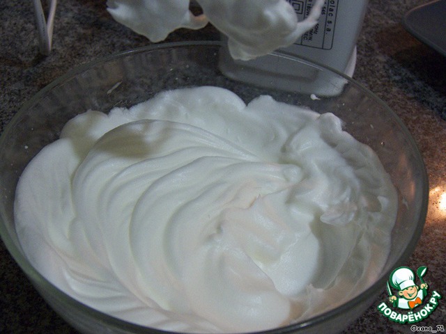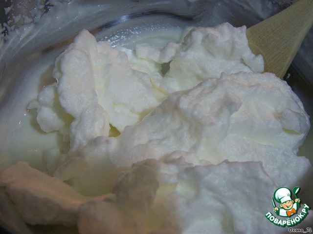 Смешиваем очень осторожно две массы (творожную и белковую). Поставим в холодильник на 30 минут.