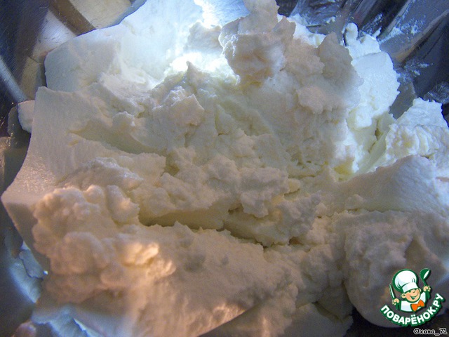 Рикотту (или творог) разотрём с сахарной пудрой и сливками.