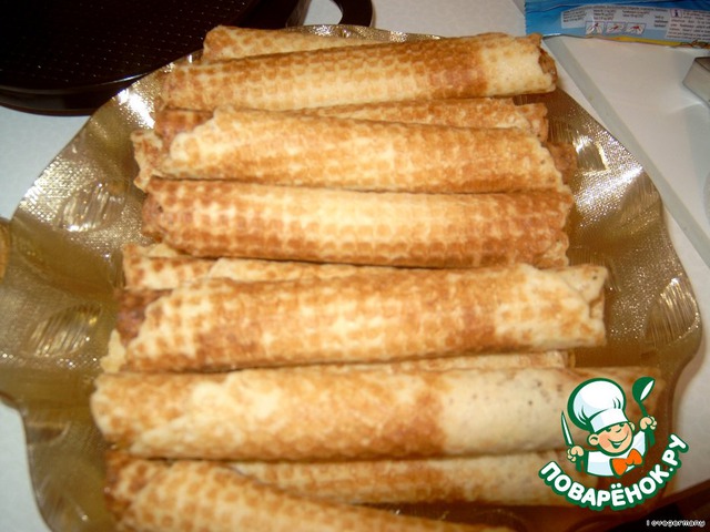 Яйца взбить с сахаром и ванилином, добавить растопленный маргарин и муку, замесить тесто. Выпекать в электровафельнице, выкладывая по 1 ст. ложке на середину. Ещё горячими быстро свернуть в трубочку