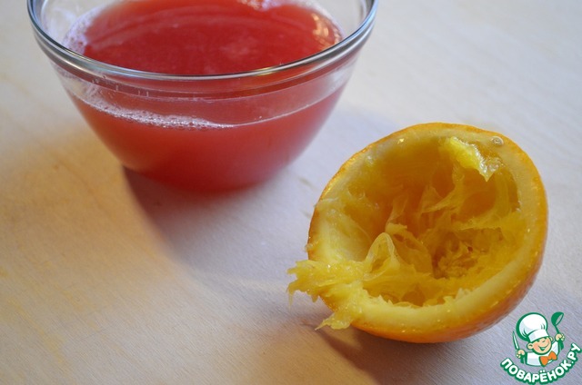 2. С половинки апельсина отжать сок, снять цедру. Арбузный сок смешать с цедрой и апельсиновым соком.