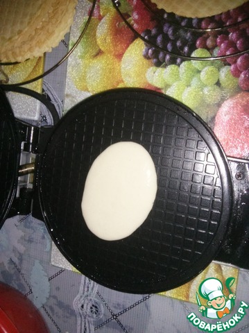 Выпекаем вафли. На разогретую вафельницу выливаем ст. ложку теста, печем 3-4 мин.