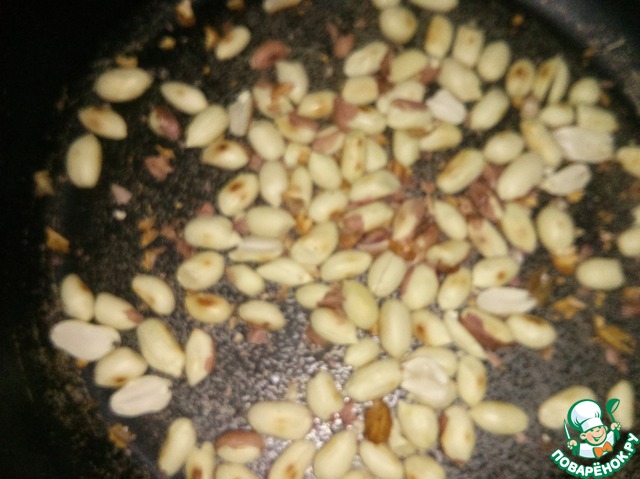 Когда вафли почти все выпечены, начинаем делать начинку, зарание не получится, т. к. она застывает. Начнём с орехов, у меня был только арахис. Орехи подсушить.