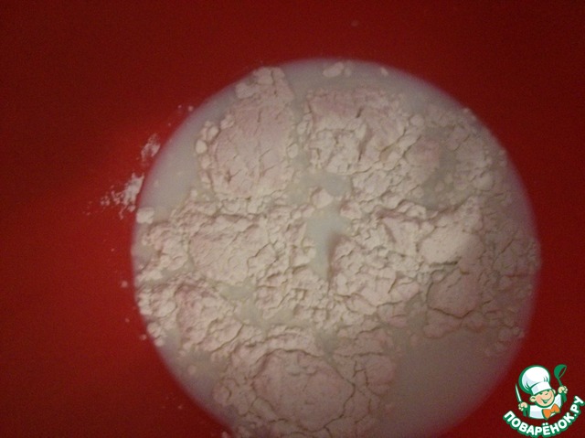 Теперь, в молоко добавляем по немного муки, взбиваем миксером на небольшой скорости, добавляя всю муку.