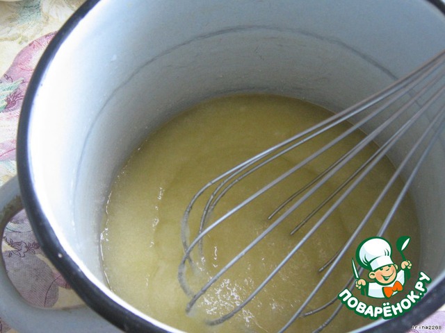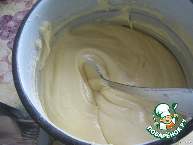 Добавить муку, крахмал и разрыхлитель. Тесто получается густое. Дать ему постоять минут 30