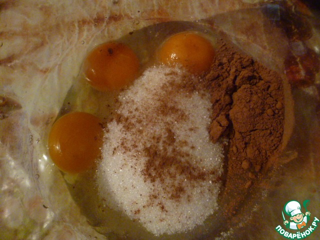 3 яйца, 150 г сахара, щепотку соли и 1 столовую ложку какао