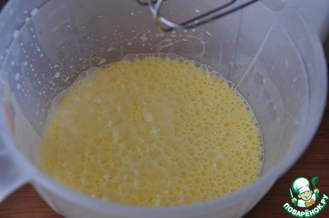 В другой миске смешиваем жидкие составляющие: яйца, молоко пониженной жирности, растительное масло. Взбиваем миксером.