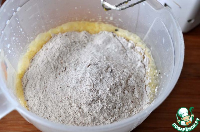 В одной миске смешиваем сухие ингредиенты: оба вида муки, соль, кэроб и разрыхлитель.