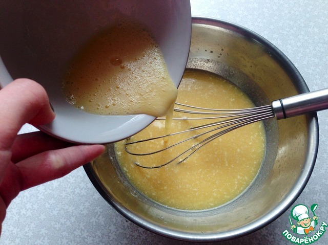 Переливаем нашу молочно-дрожжевую смесь в миску, в которой будем замешивать тесто. Туда же добавляем остывшее масло. Перемешиваем венчиком.