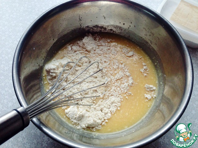 Постепенно начинаем добавлять муку. Когда добавили пару ложек муки - добавьте разрыхлитель и ванилин. Замешиваем густое тесто.