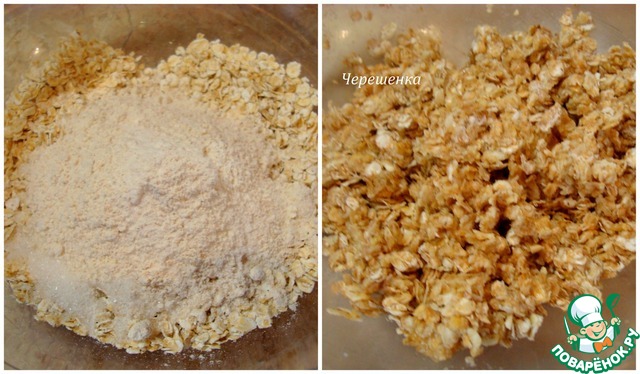 Смешать хлопья, муку и сахар. Масло растопить и вместе с водой добавить к хлопьям. Перемешать.