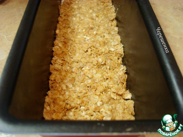 Форму для запекания (у меня размером дл.26см, шир.11см, высота 7см) смазать тонким слоем сливочного масла. Выложить нашу основу, распределив ее пальчиками по дну. Не утрамбовывать!