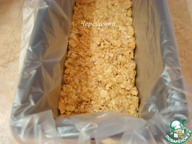 Выпекать в духовке при 180 градусах 10 минут. Дать остыть. Вытащить основу из формы. Застелить ее пленкой, я просто использовала пакет. А сверху снова положить выпеченную овсяную основу.