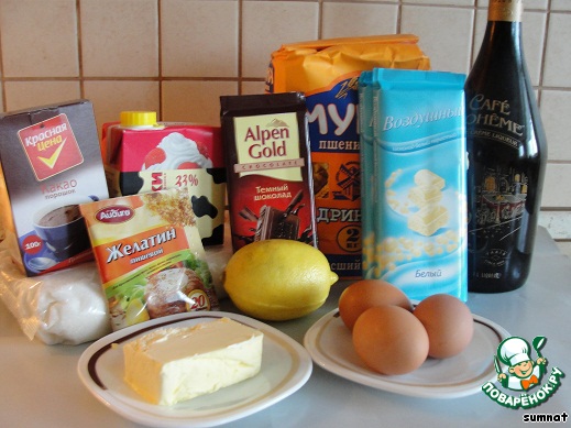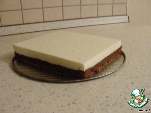 5. В 100 гр. сливок замочите желатин, оставшиеся 400 гр. сливок взбейте миксером до стойкости (у меня сопротивлялись, пришлось использовать загуститель). Растопите на одной водяной бане две плитки белого шоколада, на другой – набухший желатин. Смешайте, взбейте и дайте немного остыть. (На этом этапе у меня случился небольшой казус – белый пористый шоколад «Воздушный» совершенно не хотел топиться, как обычно топится шоколад с какао. Пришлось добавить грамм 100 молока, но комочки все равно оставались. Миксер за минуту решил эту проблему. Так что имейте это ввиду, или покупайте белый непористый шоколад).
