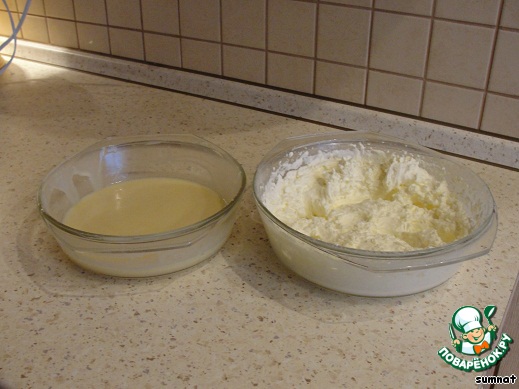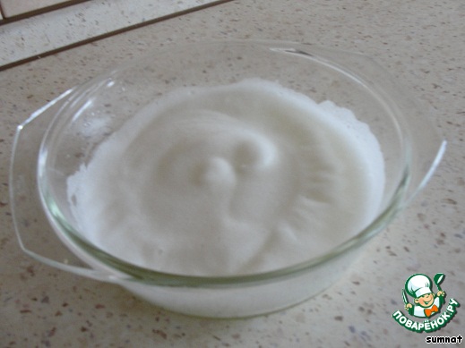 потом добавил сахар и взбивал до крепких пиков. Убрал миску в холодильник.