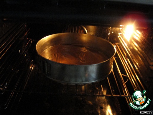 4. В застеленную пергаментом и смазанную маслом форму выложите тесто, поставьте в разогретую до 170 градусов духовку примерно на полчасика (ориентируйтесь на капризы своей духовки; пытайте корж на предмет готовности деревянной шпажкой).