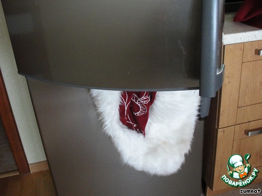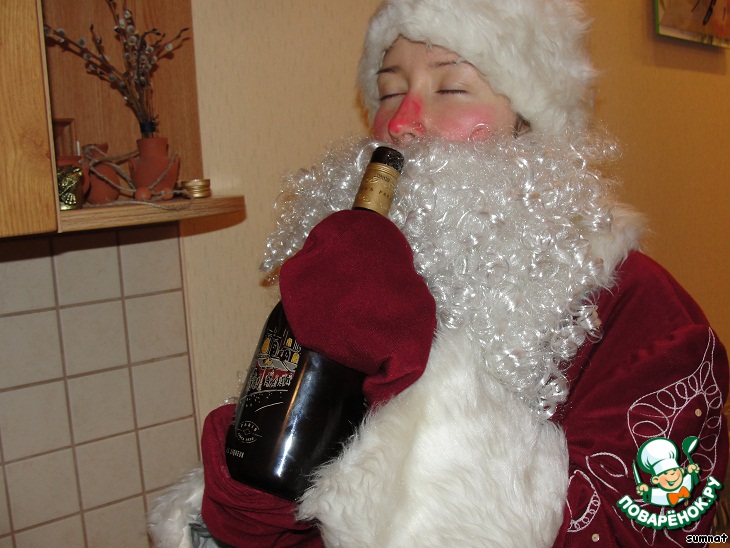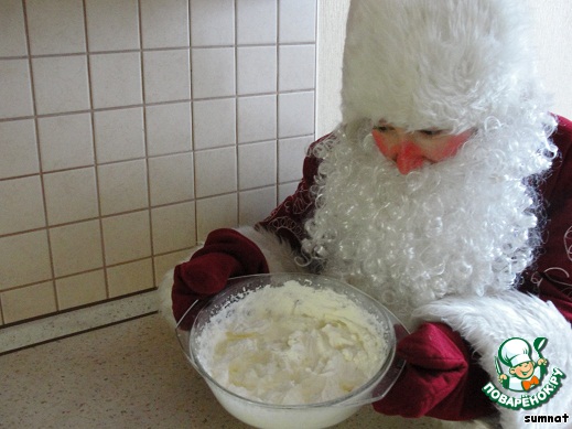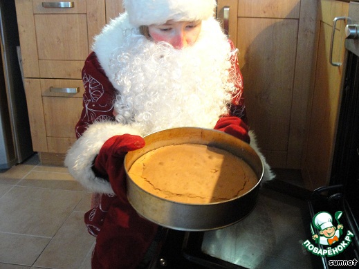 Форму поставил в предварительно разогретую до 170 градусов духовку на полчасика. От горячей духовки воздух в небольшой, но, как мы помним, уютной кухне Елкиных-Палкиных тоже прилично нагрелся, и Деду нашему Морозу стало жарко, и даже вкусный лед уже не помогал. А что вы хотели? В шубе-то, в валенках, с бородой до пояса возле разогретой печи?