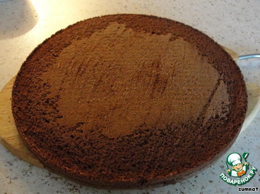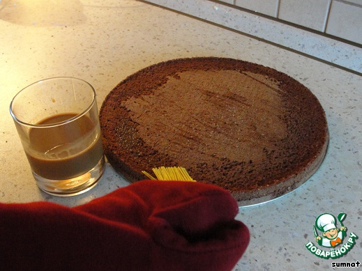 7. Тщательно пропитайте корж ликером (не жалейте, грамм 50 жидкости точно должно уйти). Если к угощению получат доступ детишки, возьмите безалкогольную пропитку.
