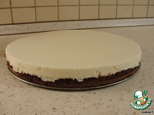 8. Поместите корж обратно в форму с бортиками и залейте получившимся кремом (будьте внимательны – если дно неплотно прилегает к бортам, часть крема может просочиться. Можно избежать этого, плотно обернув корж по периметру бумагой. Я использую пергамент, сложенный по длине трижды). Уберите форму в холодильник на 2-3 часа (если, конечно, у вас в хозяйстве не найдется Деда Мороза с арктическим дыханием