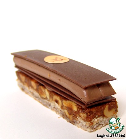 Затем накрываем всю конструкцию последним шоколадным прямоугольником, который украшаем целым фундуком, посаженным либо на глюкозу, либо на мед.