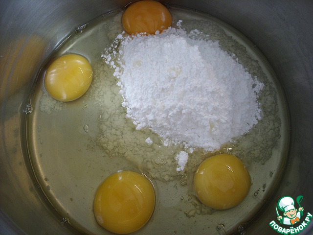 Яйца (4 шт.) слегка взбить с сахарной пудрой (100-120 гр) в кастрюле, затем переставить ее на водяную баню.