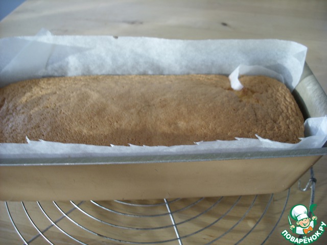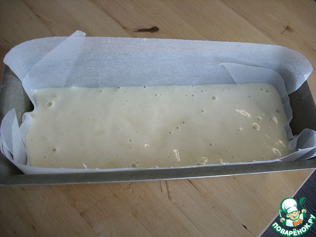 Прямоугольную форму для кекса застелить пергаментом, влить наше тесто и выпекать в заранее разогретой духовке при 180 гр 30-35 минут. Размер моей формы 30х10 см, высота бортика 7 см.