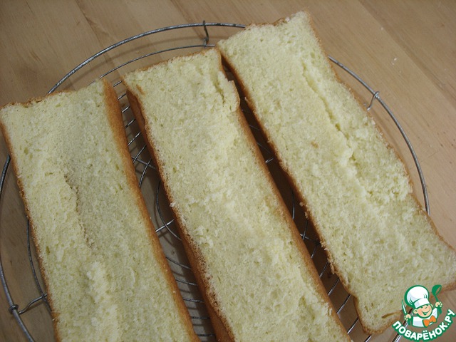 Холодный бисквит разрезать вдоль на три одинаковые части.