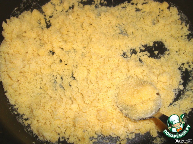 Масло растопить в сковороде, всыпать манную крупу, хорошенько перемешать и выключить.