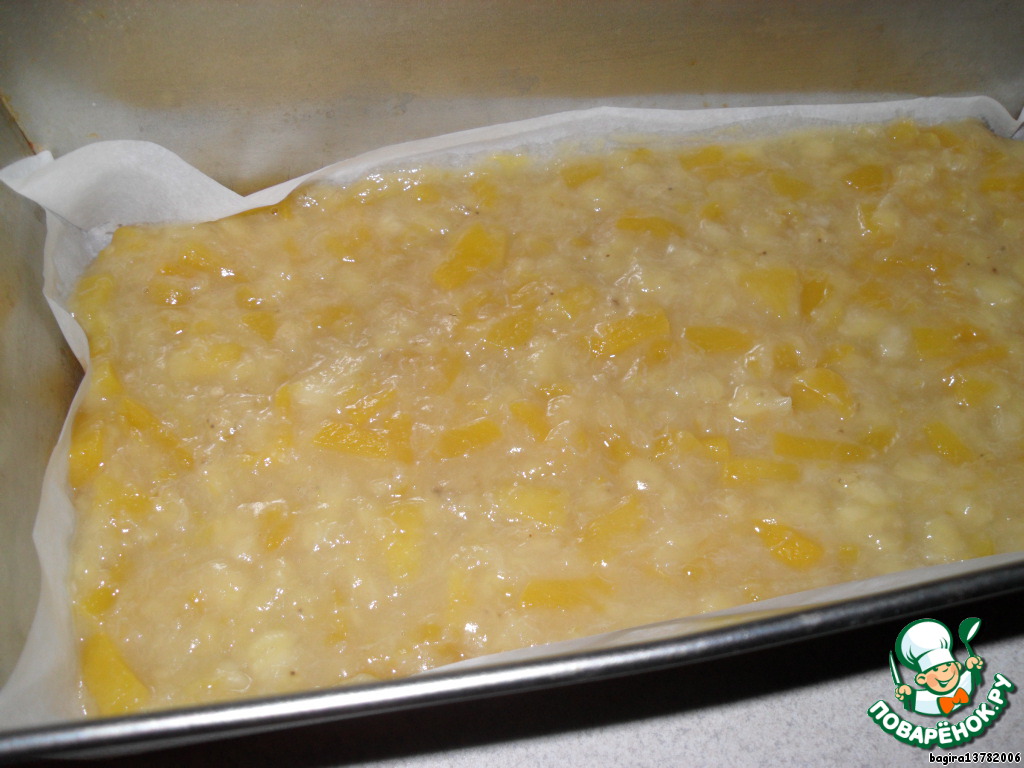 Форму для выпекания (21х11 см) обернем фольгой, сложенной в несколько раз, внутрь положим бумагу для выпечки, выложим тесто и поставим в нагретую до 160 градусов духовку на противень с горячей водой. Получится водяная баня в духовке. Во время выпечки духовку открывать нельзя.