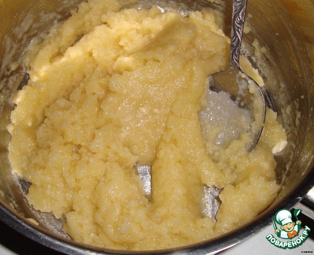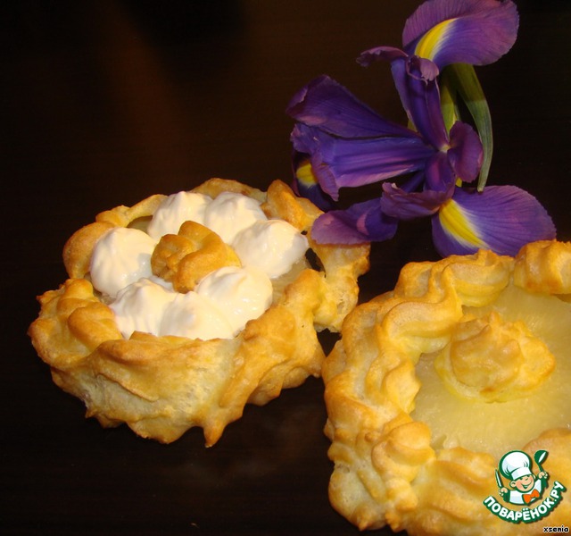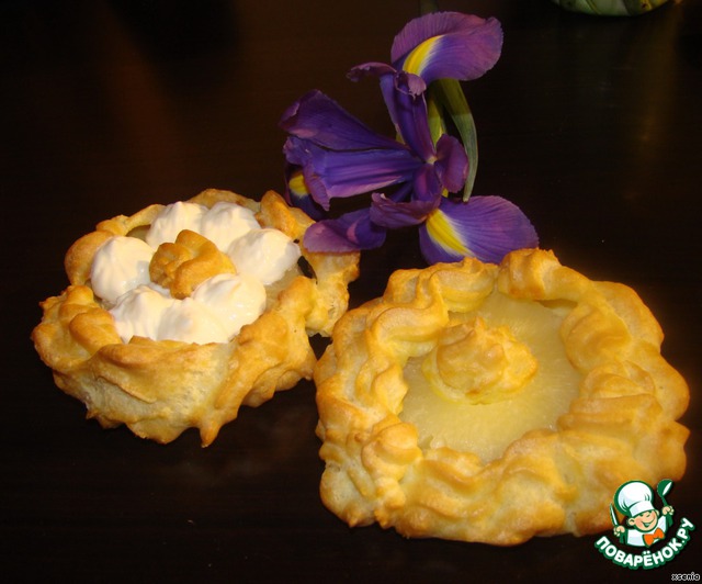 Для теста вскипятим воду с маслом и щепоткой соли .В кипящую воду всыпаем муку и мешаем до однородной ,гладкой массы .Немного остудим .Вбиваем яйцо за яйцом постоянно перемешивая .Тесто должно стать вязким и тягучим