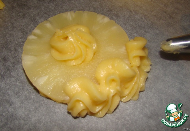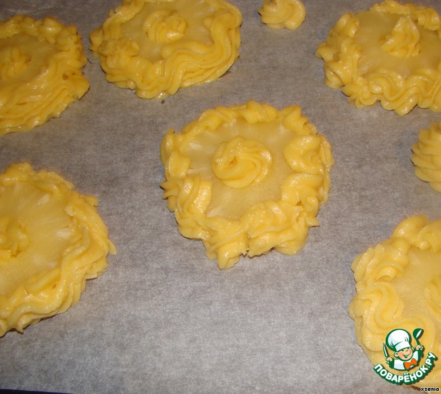 Противень застелем пекарской бумагой . Тесто выкладываем в кондитерский шприц или мешочек .И круговыми движениями выдавливаем на бумагу основу для пирожных(Лучше сплошняком .вроде фотографировала .Фотка куда то делась (( .Сверху кладем кусочек ананаса ,слегка прижмем тесто под ананасом должно выступать из под ананаса