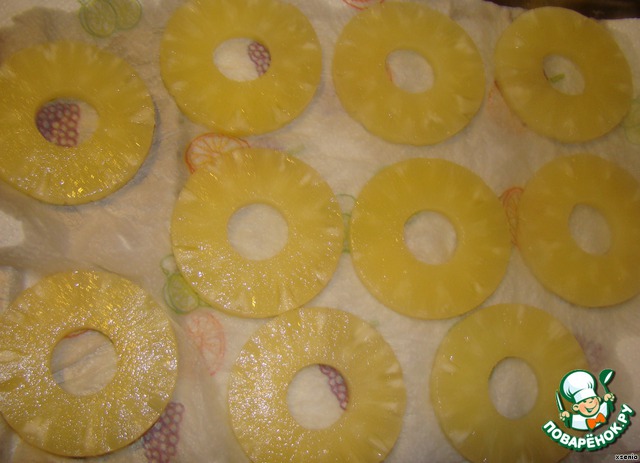 Ананасы выкладываем на салфетку .Дадим стечь соку .Ананасы должны немного обсохнуть