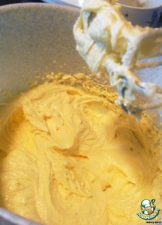 Яйца (4 шт.) разделяем на желтки и белки, размягченное сливочное масло взбить с сахаром и солью в пышную массу, добавить желтки.