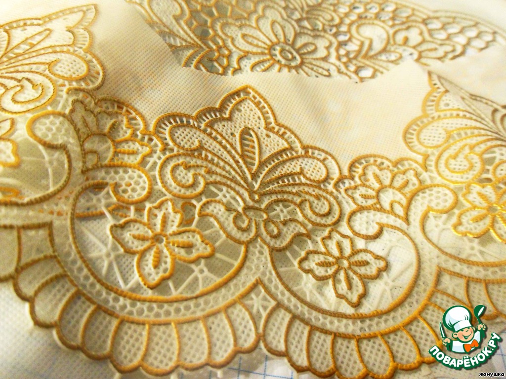 Рюши тоже делаем из мастики. С помощью рельефной салфетки из поливинилхлорида, которые наверняка завалялись у вас в чулане. Раскатываем тоненько мастику, чуть припудриваем крахмалом или сахарной пудрой, накладываем узор и хорошо перекатываем скалкой.