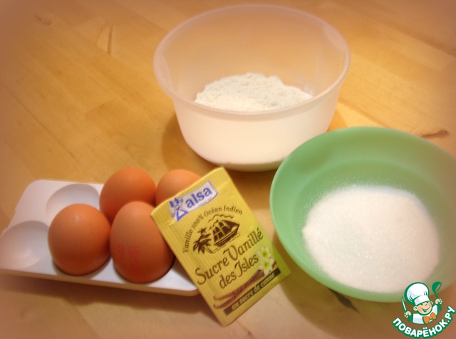Подготовим ингредиенты для бисквита "женуаз". Мука, сахар, яйца.