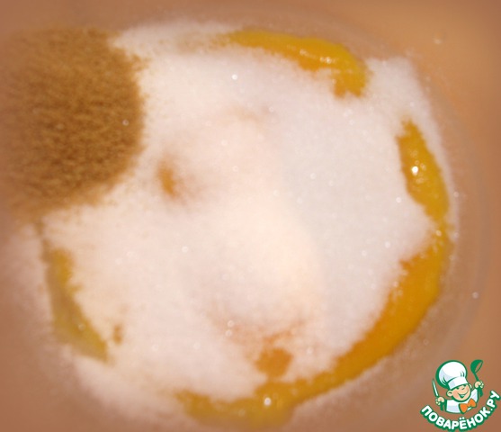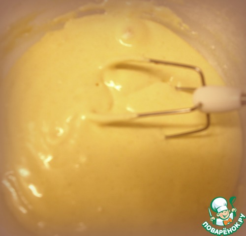Желтки (4 шт) взбить с сахаром (50 гр плюс один пакет ванильного сахара) до побеления массы.