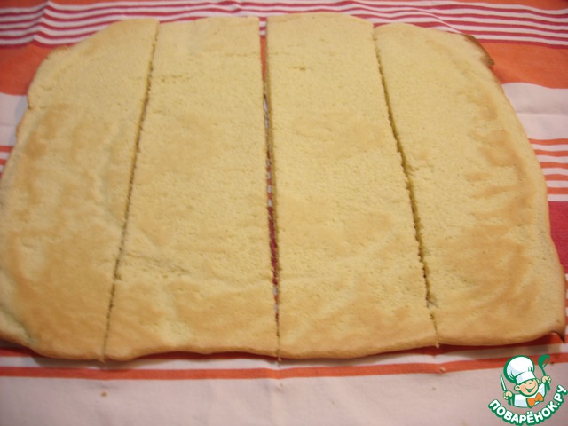 Выпекаем бисквит в разогретой до 210 градусов духовке 8 минут. Он хорошо поднимется, а когда дастанете из духовки - опадет, не пугайтесь. Затем его нужно перевернуть на влажное полотенце, освободить от бумаги и разрезать на 4 полоски вдоль.