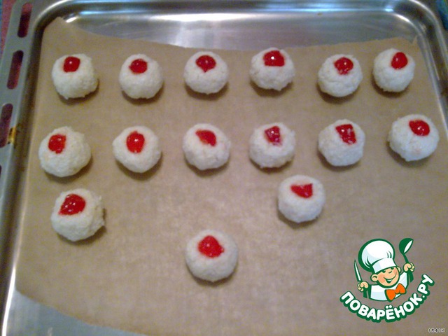 ставим в духовку на 10- 15 мин. при тем. 150 гр. вытаскиваем кокосики и посыпаем сверху оставшеися стружкои