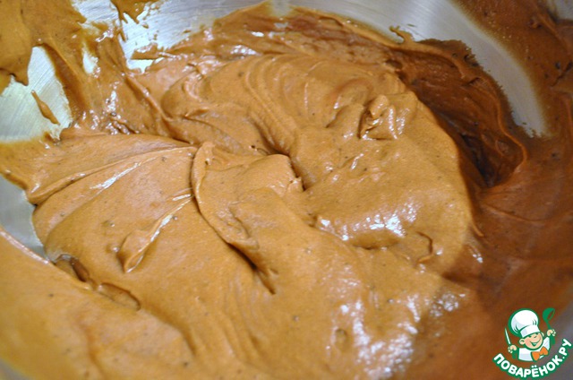 Всыпаю все оставшиеся сухие ингредиенты, перемешиваю, добавляю масло, немного разогретое в микроволновке, но оно размягченное, а не расплавленное. В заключении добавляю соду гашеную уксусом.