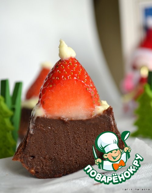 Клубнику положить на пирожные, украсить кремом в форме шапки Деда Мороза.