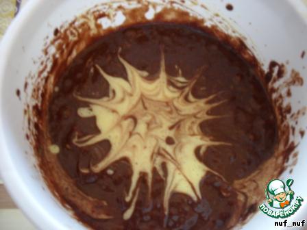 Размолотый миндаль и муку перемешать и ввести в шоколадно-яичную смесь.