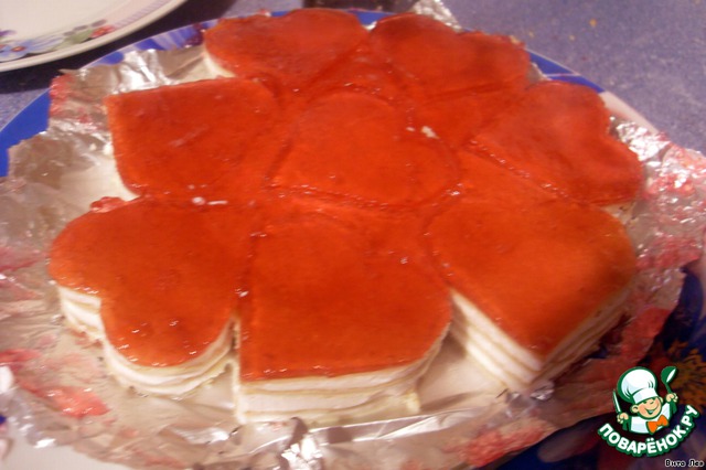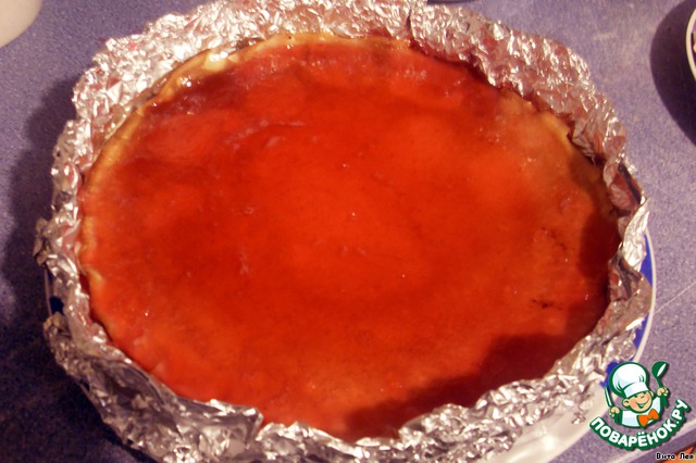 А пока займемся нашим красным слоем. Здесь 2 варианта: растопить мармелад+2ст.л. воды или вишневого сока; или желе (вишня или малина)+ 0.5 стакана воды. Достаем наш блинный торт, делаем бортики из фольги и выливаем на торт красный слой, отправляем в холод.