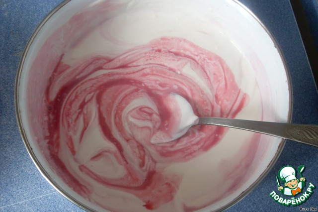 К сметане добавляем сахар и желатин (1ст.л.желатина оставляем для красного слоя). Я еще добавила 2ст.л. вишневого сока.