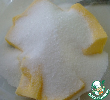 Взбить 100 граммов сливочного масла вместе с 70 гр сахара, щепоткой соли до пушистого, кремового состояния.