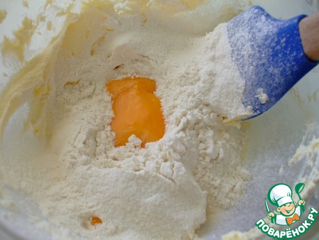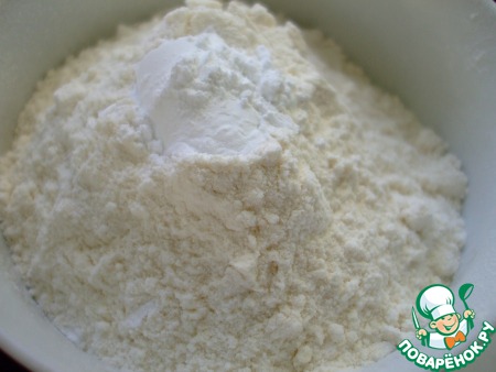 Просеять сверху смесь муки (125 граммов) с 1/2 чайной ложки разрыхрытеля.