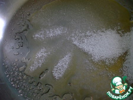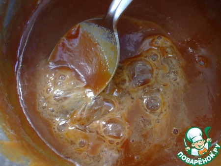 Приготовить карамель на среднем огне всухую. Насыпать в сковороду или в сотейник с толстым дном 90 гр сахара, потряхивая сковороду за ручку, дождаться полного растворения сахара и приобретения карамели красновато-золотистого цвета... ложкой и лопаткой не мешать!!!).